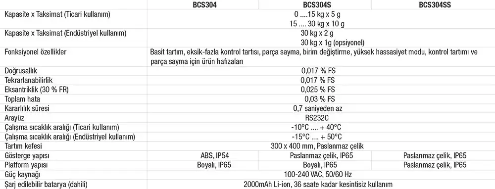 • BCS304 Serisi Masa ve Tezgah Tipi Teraziler, hızlı ve kolay temizlenebilme özellikleri ile ıslak ve hijyenik koșulların etkili olduğu çeșitli endüstriyel ortamlar için uluslararası normlarda üretilmektedirler.