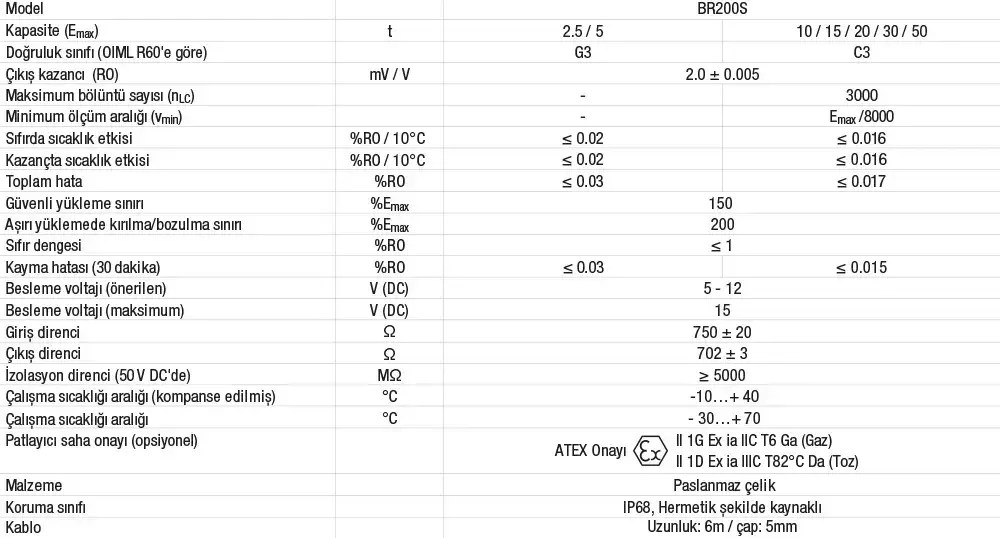 • BR200S, EU OIML R60 C3 onaylı, yüksek performanslı, alçak profil baskı tipi yük hücresidir. Paslanmaz çelik yapısı ile IP68 koruma sınıfına sahiptir.