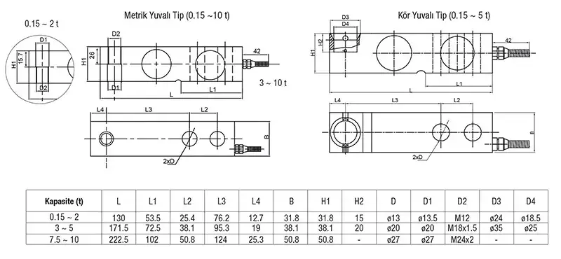 • IP68 koruma sınıfına sahip metrik dișli ve kör yuvalı modelleri ile yer kantarları, konveyör, tank, silo tartım sistemleri gibi her türlü endüstriyel tartım uygulamalarına son derece uygundur.