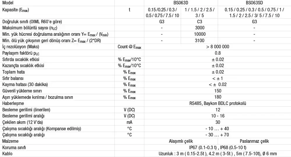 • BS063D ve BS063SD nikel kaplı alașımlı çelik/paslanmaz çelik yapıda, gelișmiș elektronik tasarımı ile yüksek çözünürlüklü, hassas ve güvenilir bir yük hücresidir. 150 kg'dan 10000 kg'a kadar geniș bir kapasite aralığına sahiptir. BS063D/BS063SD dijital yük hücreleri arızalı yük hücresi değișimi sonrası kalibrasyon ayarı gerektirmeksizin çalıșmayı sağlayacak eșleștirilmiș üretim özelliklerine sahiptirler.