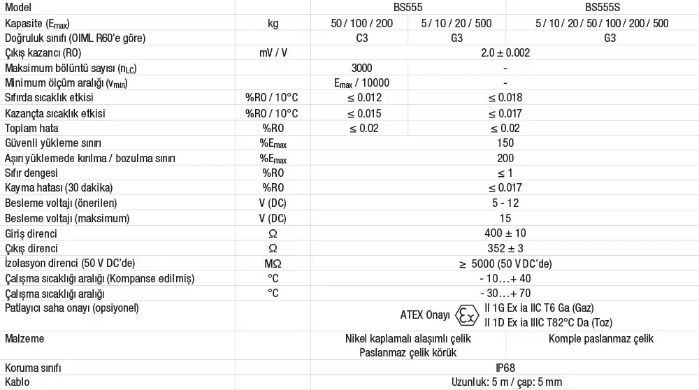 • Model BS555 nikel alașım çelik yapıda, paslanmaz çelik körüklü, BS555S komple paslanmaz çelik yapıda,5 kg'dan 500 kg'a kadar değișen kapasitelerde, OIML R60 C3 onaylı, yüksek hassasiyetli yük hücreleridir.