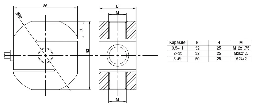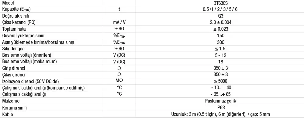 • Model BT630S, paslanmaz çelik yapıda, IP68 koruma sınıfına sahip askı tipi (S Tip) bir yük hücresidir.