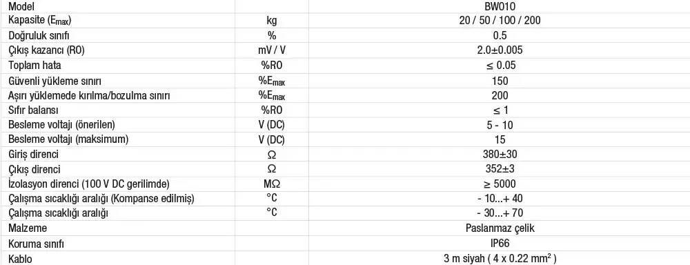 • BW010 gerginlik ölçen yük hücreleri paslanmaz çelik yapıda olup, uygulamaya bağlı olarak geniș bir kapasite seçeneğine sahiptir.