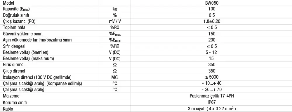 • BW050 gerginlik ölçen yük hücreleri paslanmaz çelik yapıda olup, uygulamaya bağlı olarak geniș bir kapasite seçeneğine sahiptir