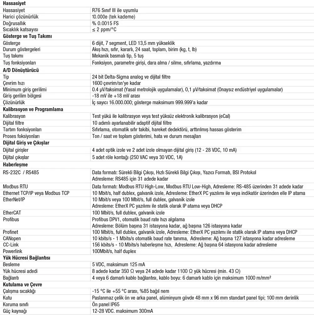• 48 x 96 mm panel tip ölçülerinde olup, standart RS232, RS485, Ethernet TCP/IP, EtherCAT, Modbus RTU, Profibus, Profinet, CANopen, CC-Link, ve Powerlink gibi iletișim standartları ile PC/PLC/DCS entegrasyonunda güçlü seçenekler sunar