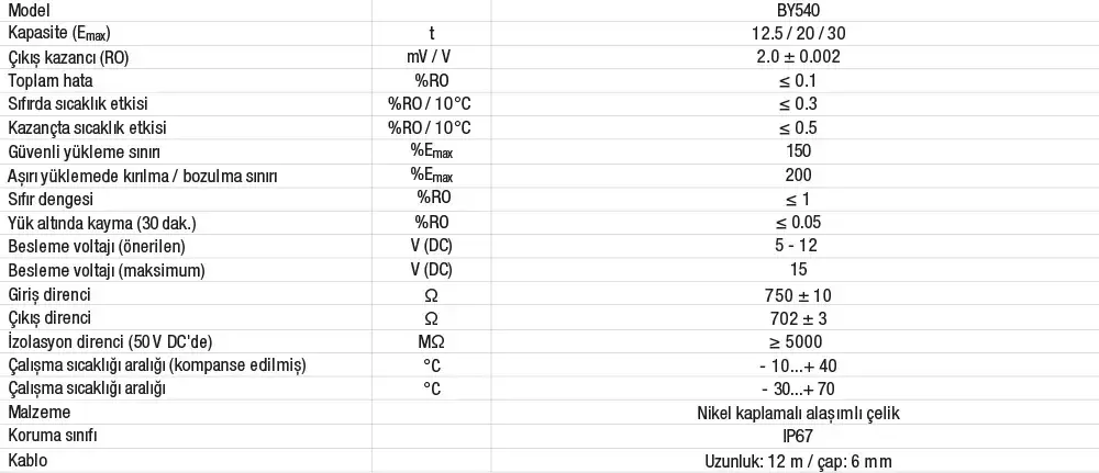 • BY540, alașımlı çelik yapıda, kaynaklı ve IP67 koruma sınıfına haiz yüksek performanslı bir yük hücresidir.