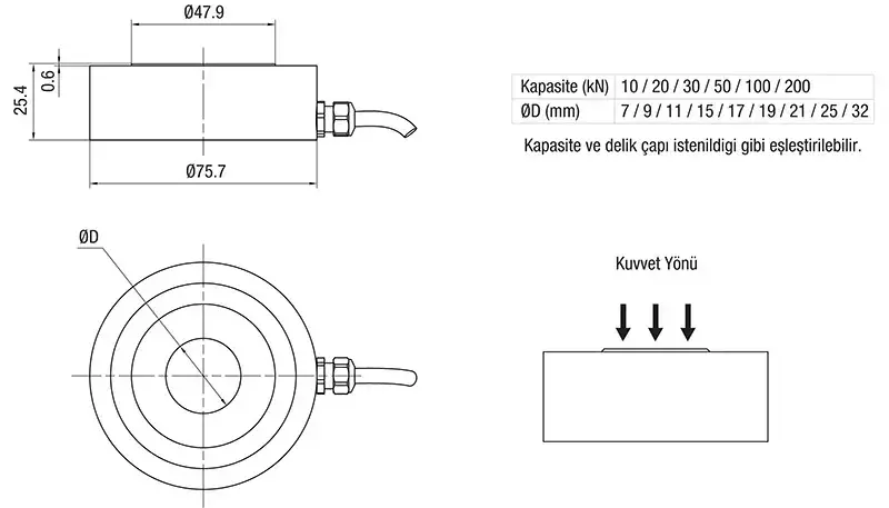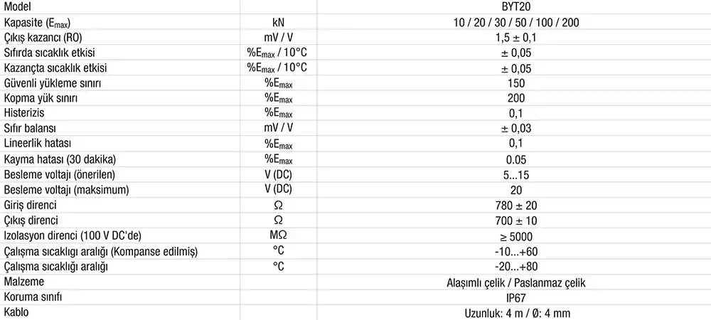 • BYT20, bir cıvatanın sıkma, bir milin çekme kuvvetini ölçmek için tasarlanmıș, paslanmaz çelik veya alașımlı çelik yapıda, kompakt, IP67 koruma sınıfına sahip, yüksek performanslı baskı tipi bir yük hücresidir.