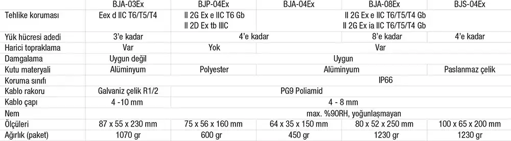 • BJ-Ex serisi Exproof yük hücresi bağlantı kutularının tartı cihazına bağlantısı 6 kablo ile yapılarak, enstrüman kablosu üzerinden gelecek hatalar minimize edilir.