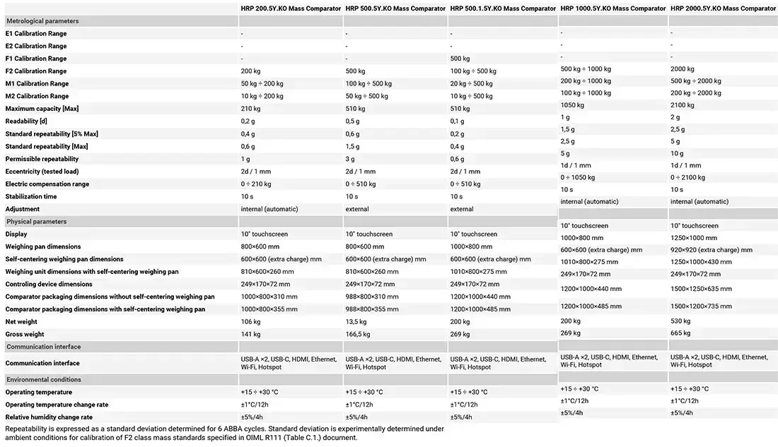 • HRP 5Y.KO serisi kütle komparatörleri, F2 sınıfı ve daha düşük sınıflar için OIML Tavsiyesine (R-111) uygun olarak kütle standartlarının ve ağırlıklarının kalibre edilmesini sağlar.