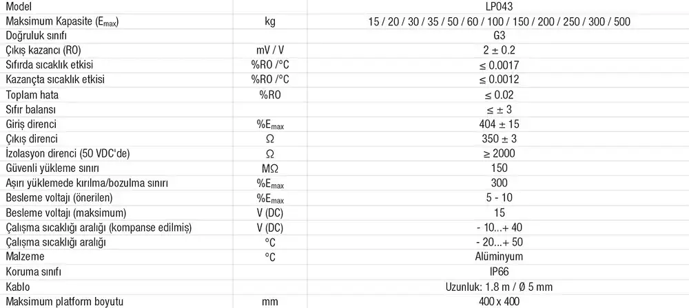 • Model LP043, alüminyum yapıda, IP66 koruma sınıfına sahip bir yük hücresidir.Özellikle masa üstü teraziler, paketleme ve dolum makinaları, test düzenekleri için yüksek performanslı tartım ve ölçüm imkanı sağlar.