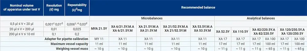 • Pipet kalibrasyon adaptörleri, gravimetrik yöntemle pistonlu pipetlerin kalibrasyonu ve doğrulanması için tasarlanmıştır. Pipet kalibrasyon adaptörünün kullanılması, tartım kabının kütlesine göre terazinin maksimum kapasitesini azaltır. Tablo, ISO 8655 standardına göre minimum gereklilikleri göstermektedir. Ayrıca pipet kalibrasyonu ve ilgili terazi versiyonu için uygun adaptörün seçilmesini sağlar.
