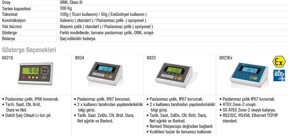 • Endüstriyel saha șartlarına uygun paslanmaz çelik, bataryalı ve ATEX Zone-II onaylı farklı tartı göstergesi seçeneklerine sahiptir. Gerektiğinde tartım kayıtları kablolu ya da kablosuz olarak yazıcı ve bilgisayara aktarılabilir.