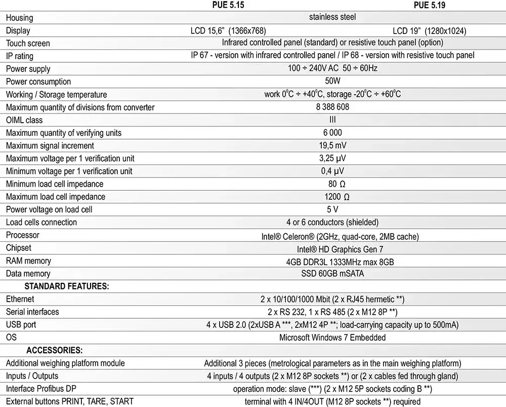 • PEU 5 tartım terminalleri, maksimum 6000 e taksimata sahip terazileri oluşturmak için tasarlanmıştır. PUE 5 serisi, temel modele benzer şekilde, en yüksek IP derecesi olan IP 67 'ye sahip paslanmaz çelik bir kutu içine yerleştirilmiştir.