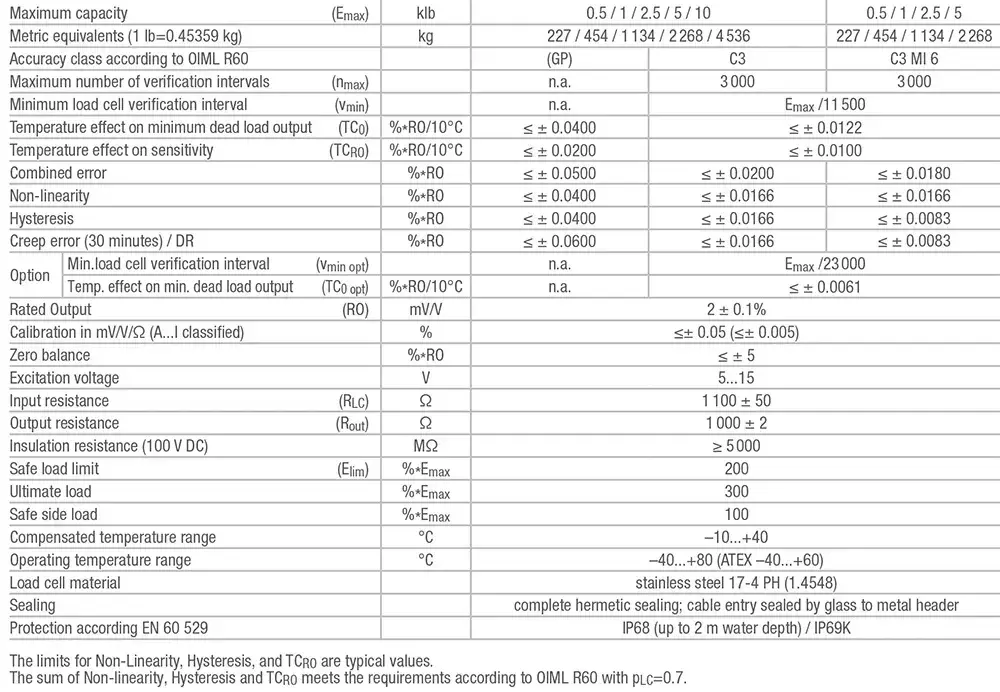 500 lb, 1 klb, 2.5 klb, 5 klb, 10 klb
